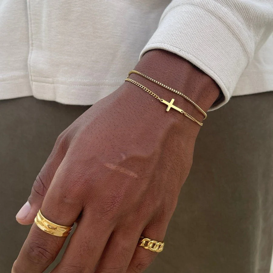 Introducing the Gold Cross Bracelet, a statement of refined durability and style. This bracelet is meticulously crafted from premium 18K gold-plated stainless steel, offering both a luxurious appearance and long-lasting wear.